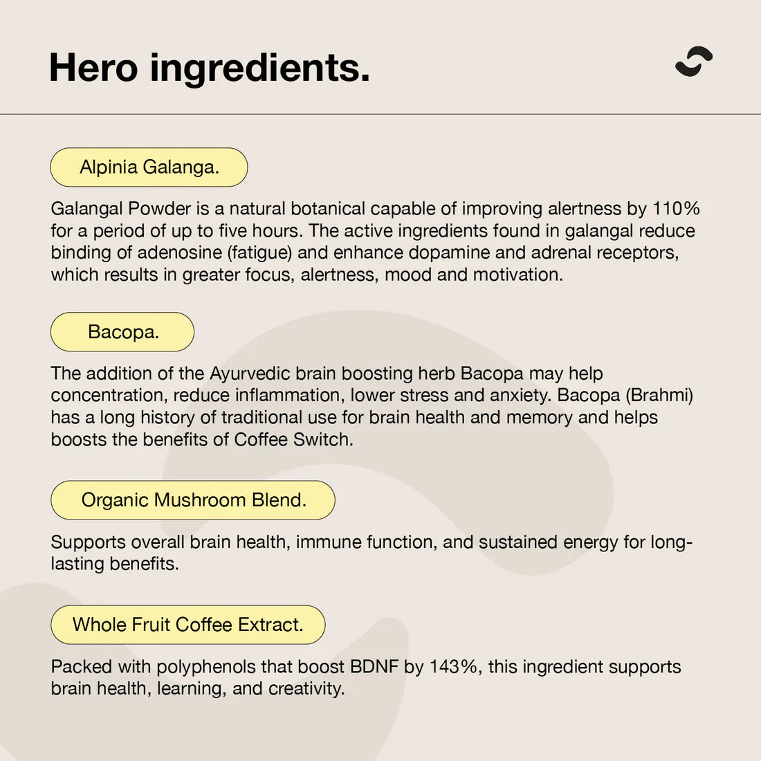Our carefully selected ingredients, including the Organic Mushroom Blend and goMCT™, are designed to provide a smooth, sustained energy boost with no jitters and no crash. Alpinia Galanga and Bacopa Monnieri have been included to sharpen focus, while naturally occurring compounds from Theobroma Cacao and Huperzia Serrata support cognitive function and mental clarity.